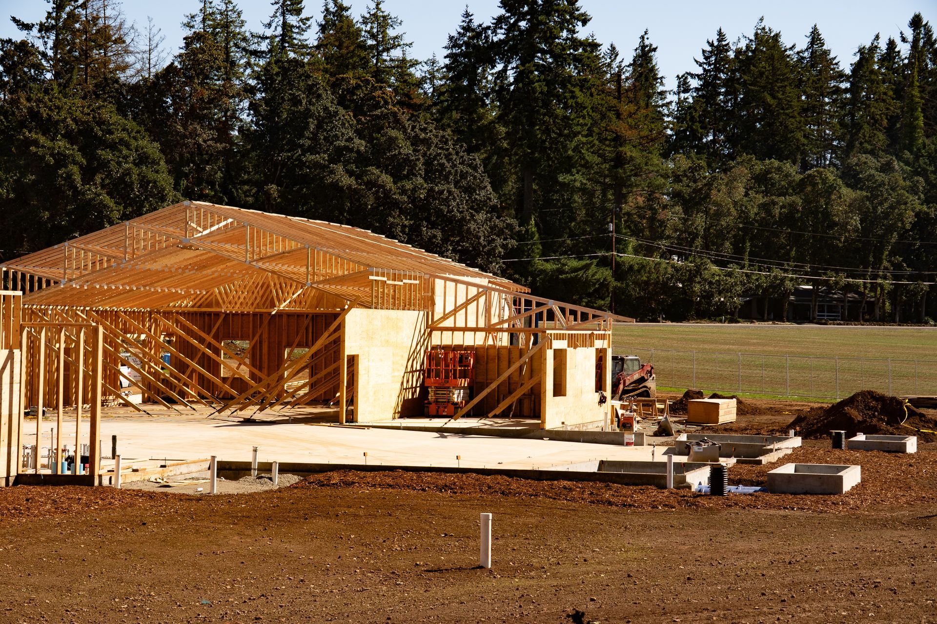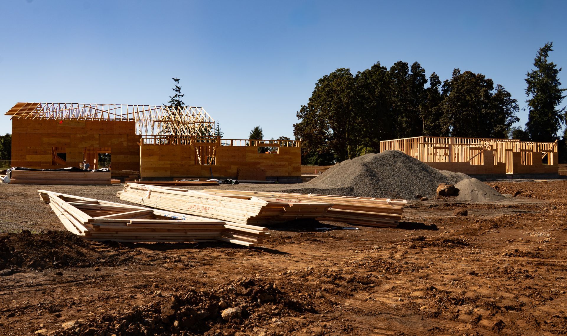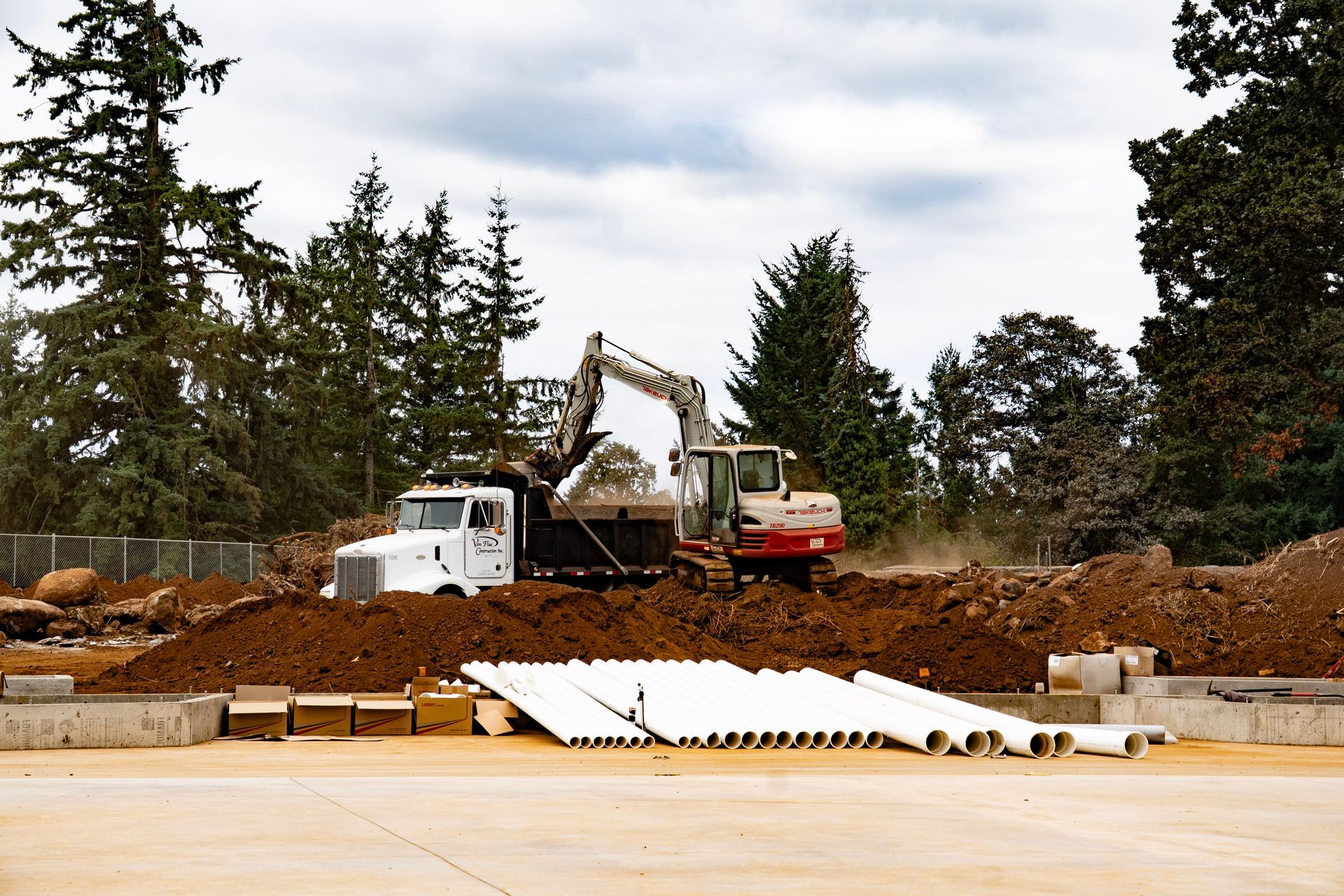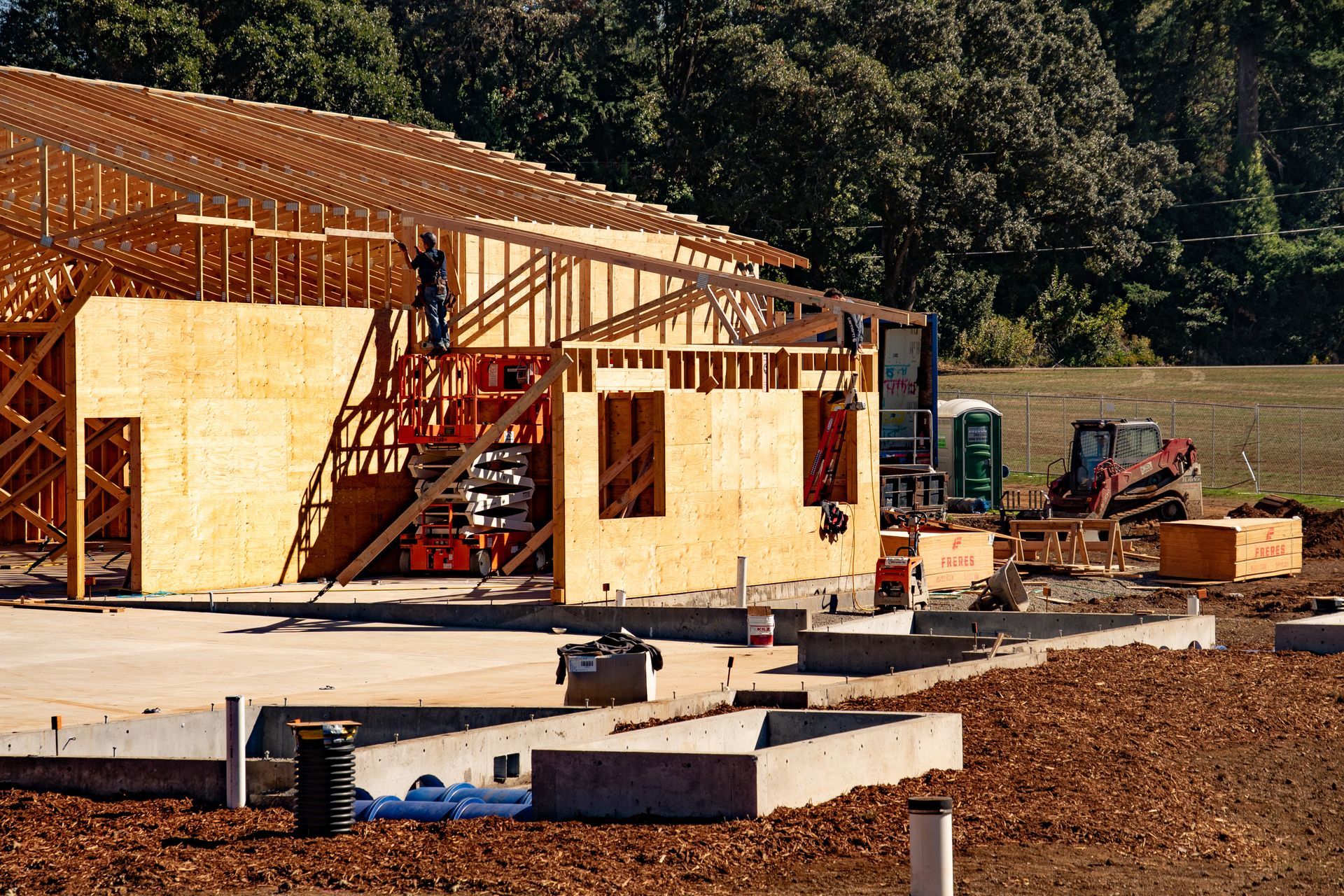 Trusses are being installed and framing continues throughout the building. The parking lot grading and landscaping areas — including the detention pond — are also taking shape.