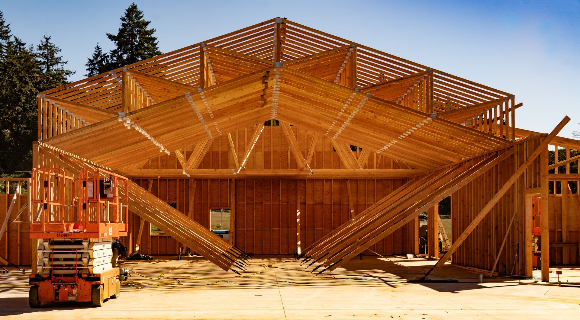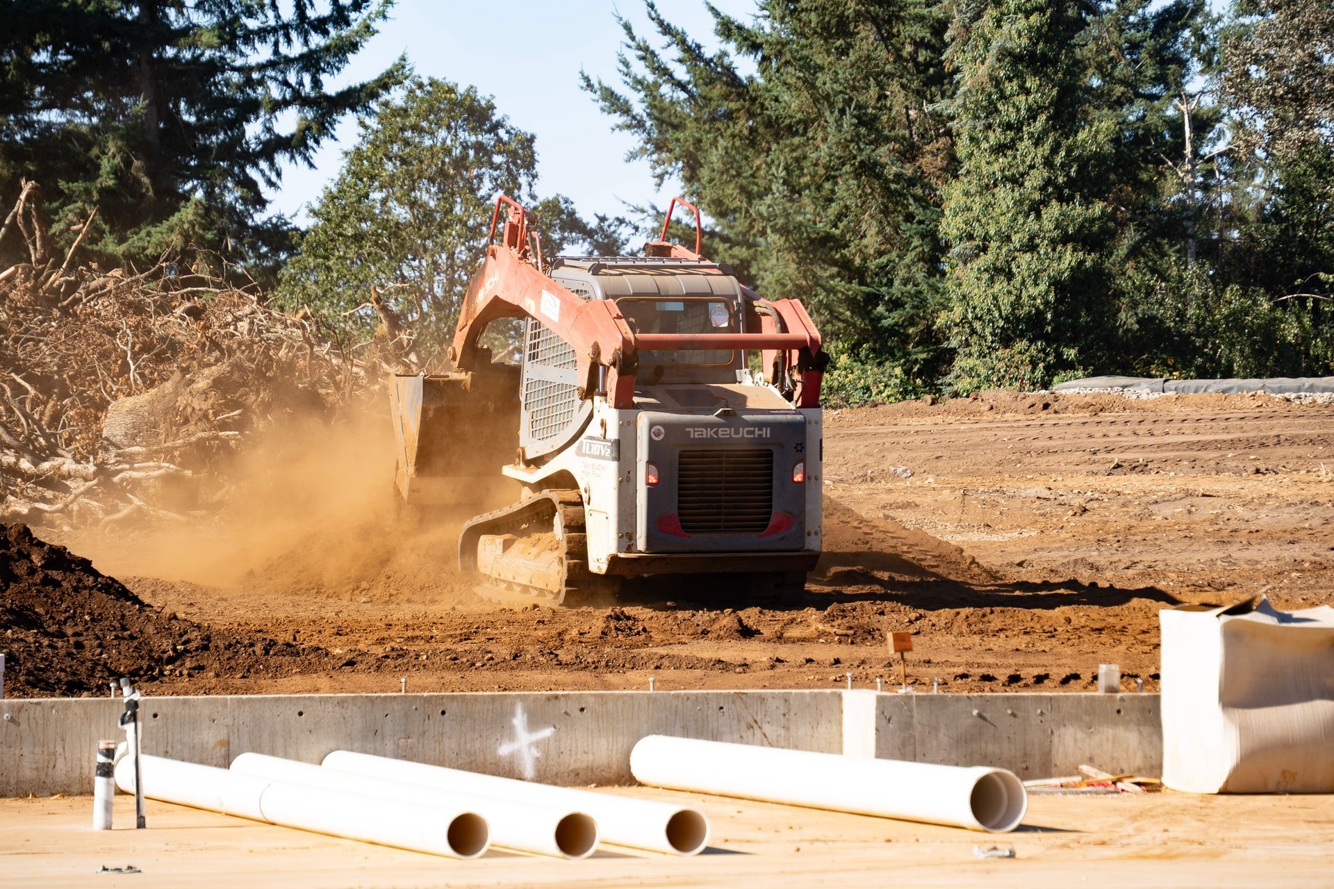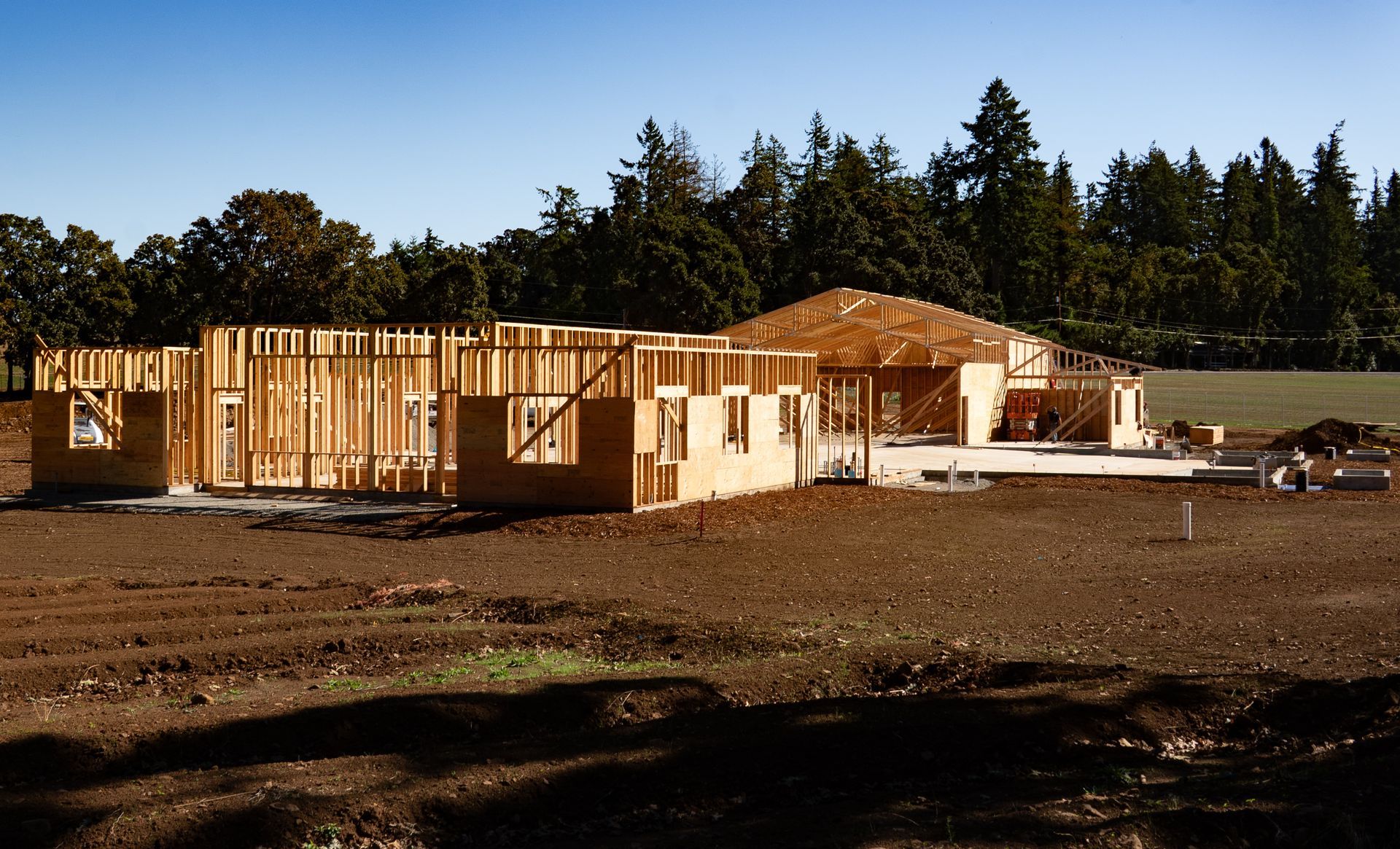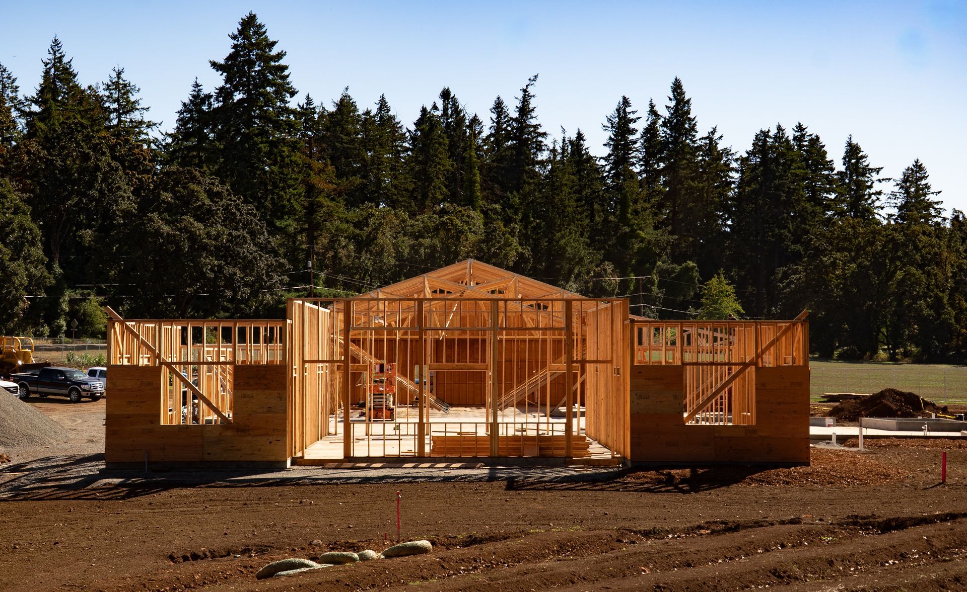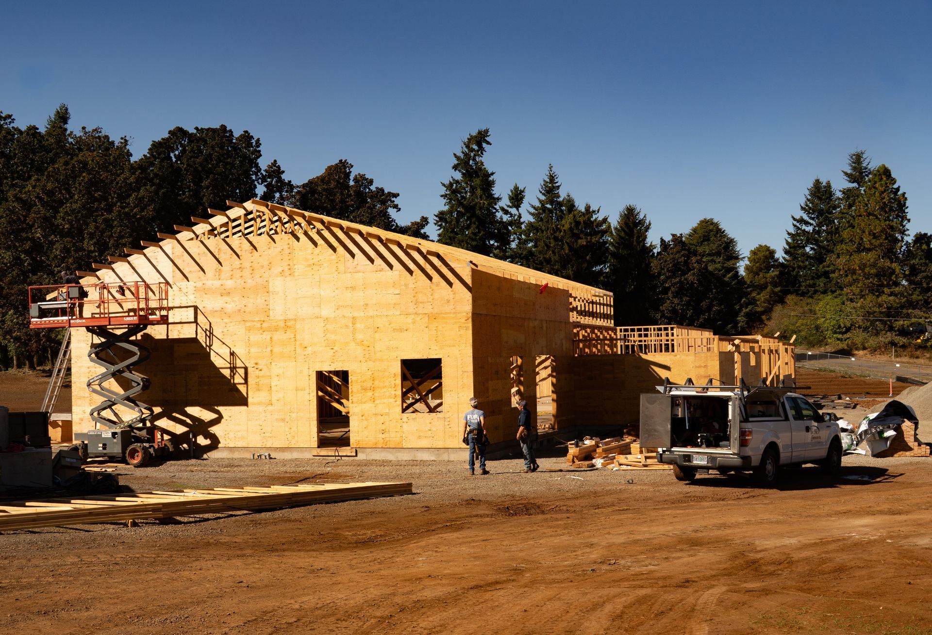 Trusses are being installed and framing continues throughout the building. The parking lot grading and landscaping areas — including the detention pond — are also taking shape.