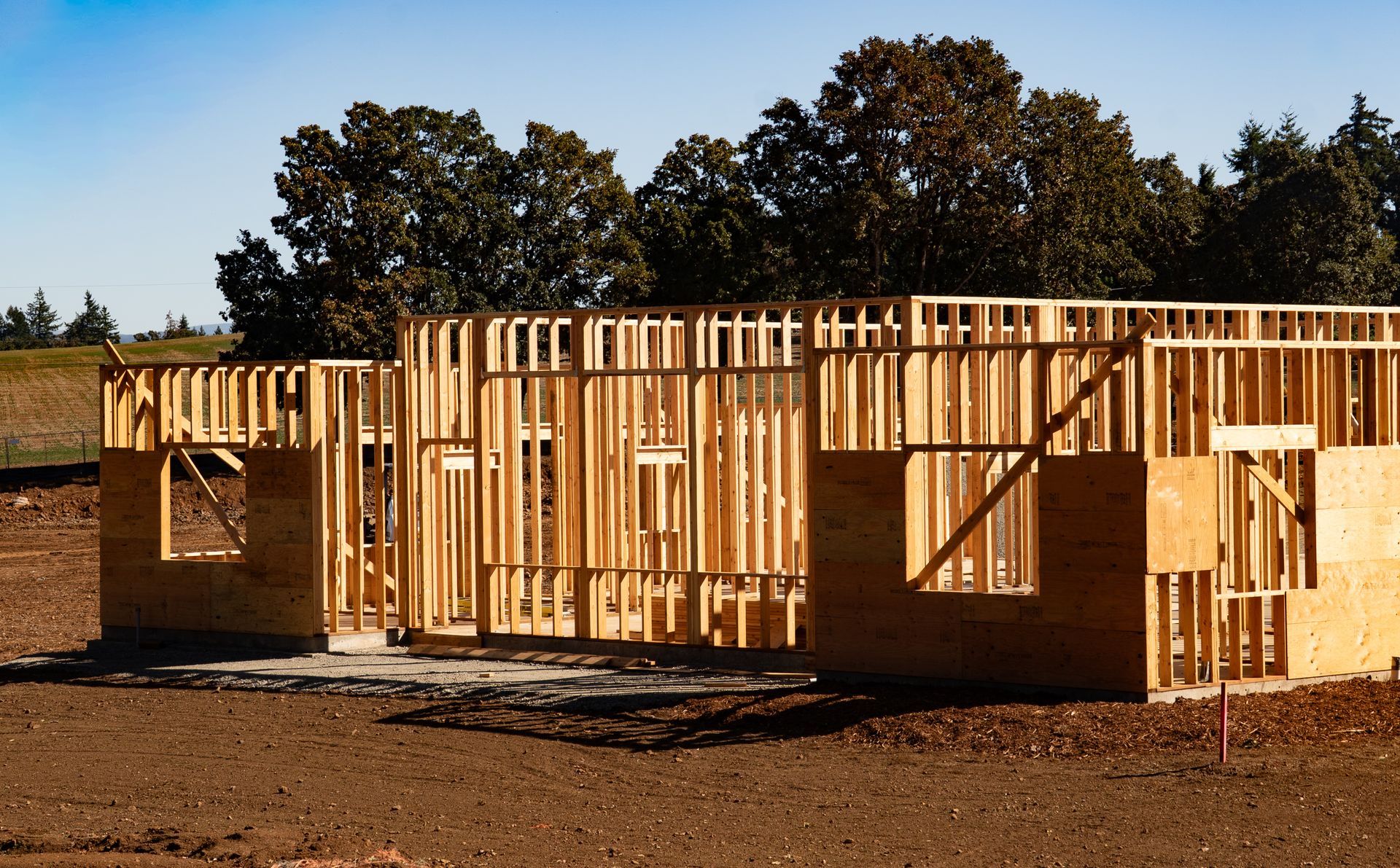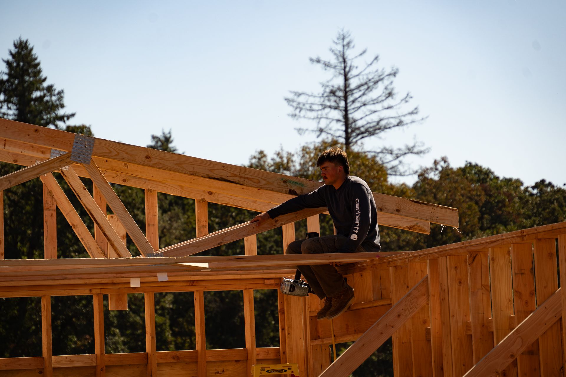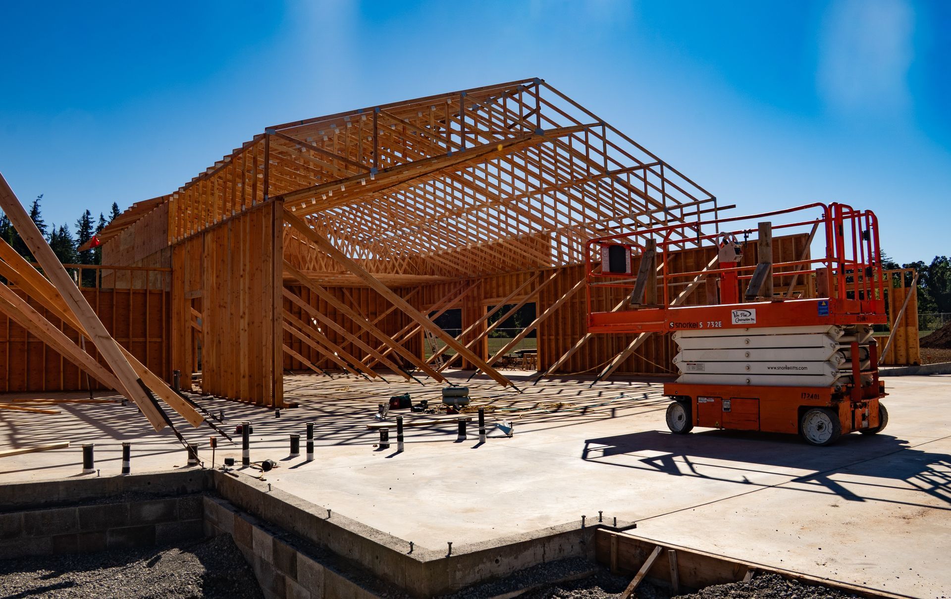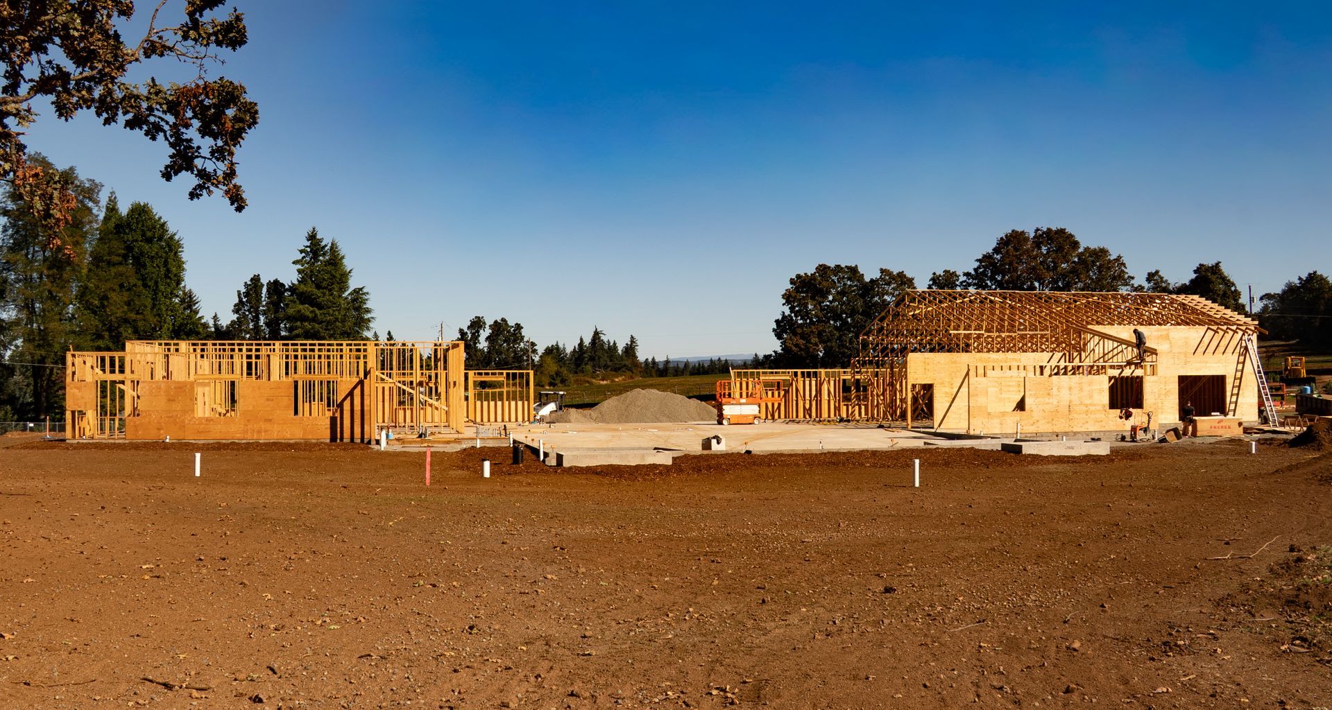 Trusses are being installed and framing continues throughout the building. The parking lot grading and landscaping areas — including the detention pond — are also taking shape.